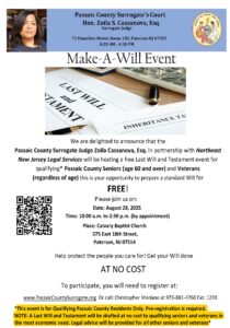 Paterson, NJ — Passaic County Surrogate Judge Zoila Cassanova, Esq., in collaboration with Northeast New Jersey Legal Services, is proud to host a free “Make a Will” event for qualifying Passaic County seniors (age 60+) and veterans (of any age) on Thursday, August 28, 2025, from 10:00 a.m. to 2:30 p.m. at Calvary Baptist Church – Fellowship Hall, 575 East 18th Street, Paterson, NJ 07514.