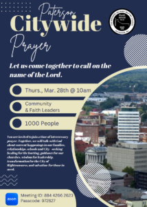 Calling all members of the Paterson, NJ/ Passaic County, NJ community to participate in the City-wide Prayer. This event has been one held since last year. The purpose is to pray for our community and its leaders. We all need to come together for the betterment of Paterson.